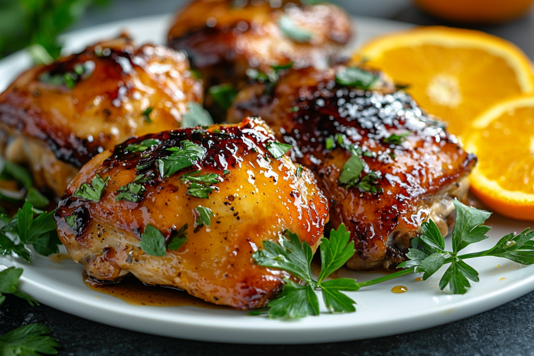 Достаю противень, поливаю курицу соусом, скопившимся на дне, и увеличиваю температуру духовки до 250°C. Возвращаю бедра в духовку ещё на 10 минут, чтобы глазурь закарамелизовалась и образовала блестящую липкую корочку. Подаю горячими, украсив дольками свежего апельсина.